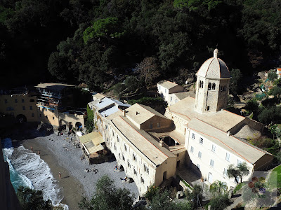 Nous nous rapprochons de l'Abbazzia di San Fruttuoso à l'abri dans une crique.L'abbaye est construite vers le VIIe siècle par des Moines Grecs venus d'Espagne avec les reliques de Saint-Fructueux-de-Tarragone. Ils fuyaient alors l'invasion musulmane de la péninsule ibérique. L'abbaye devient ensuite la propriété de la famille Doria, très influente dans la région, qui va l'agrandir, construire une tour en 1562.